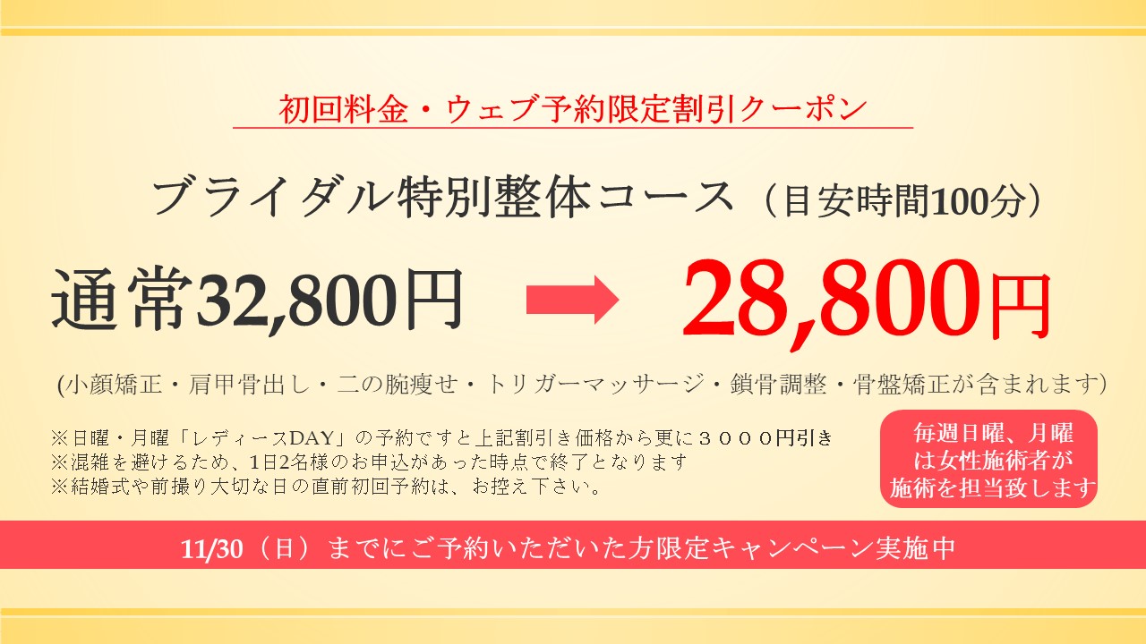 上記のような悩みの方には必見です。当院のブライダル特別コースはこの全てをOTA整体院のみで可能にさせました。