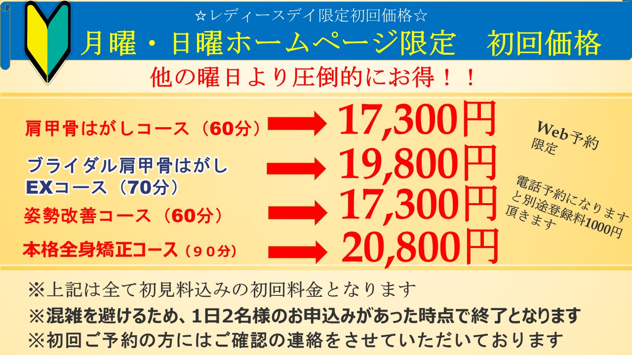 飯田橋・OTA整体院は毎週日曜・月曜日はレディースDAYとなります。